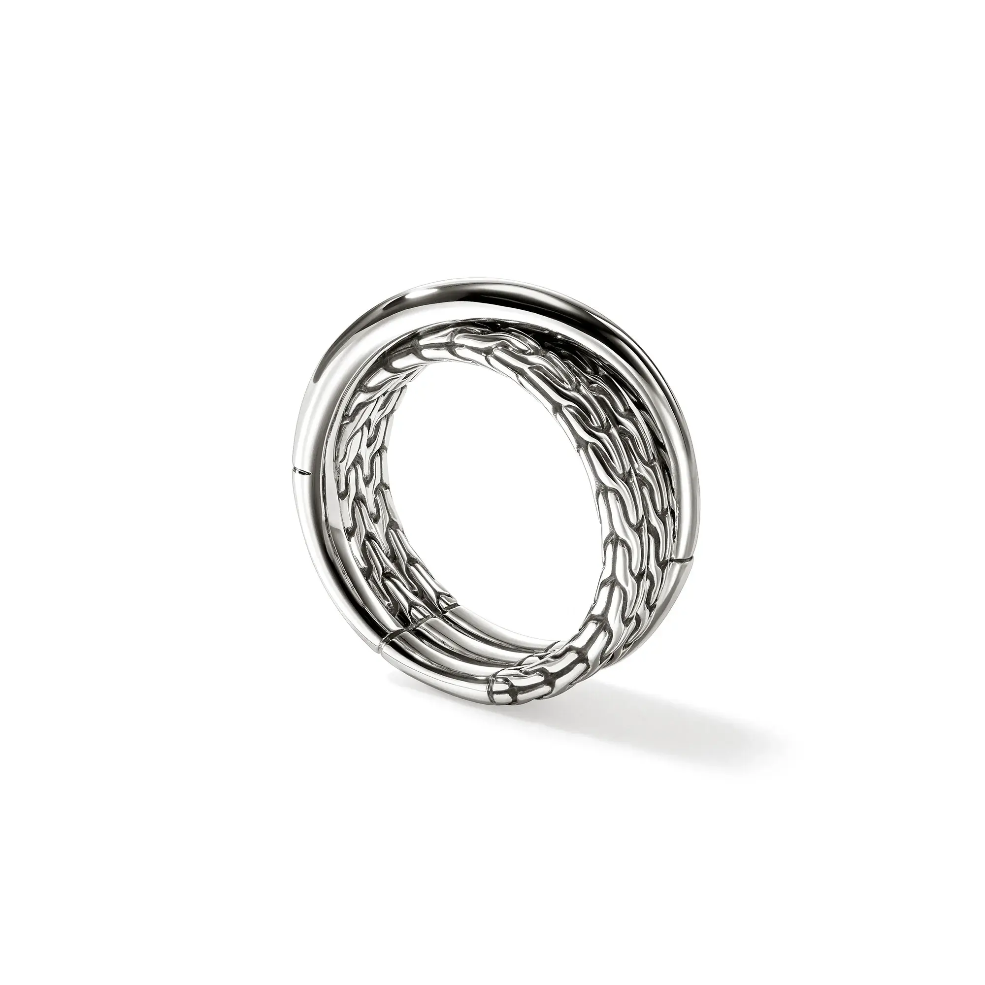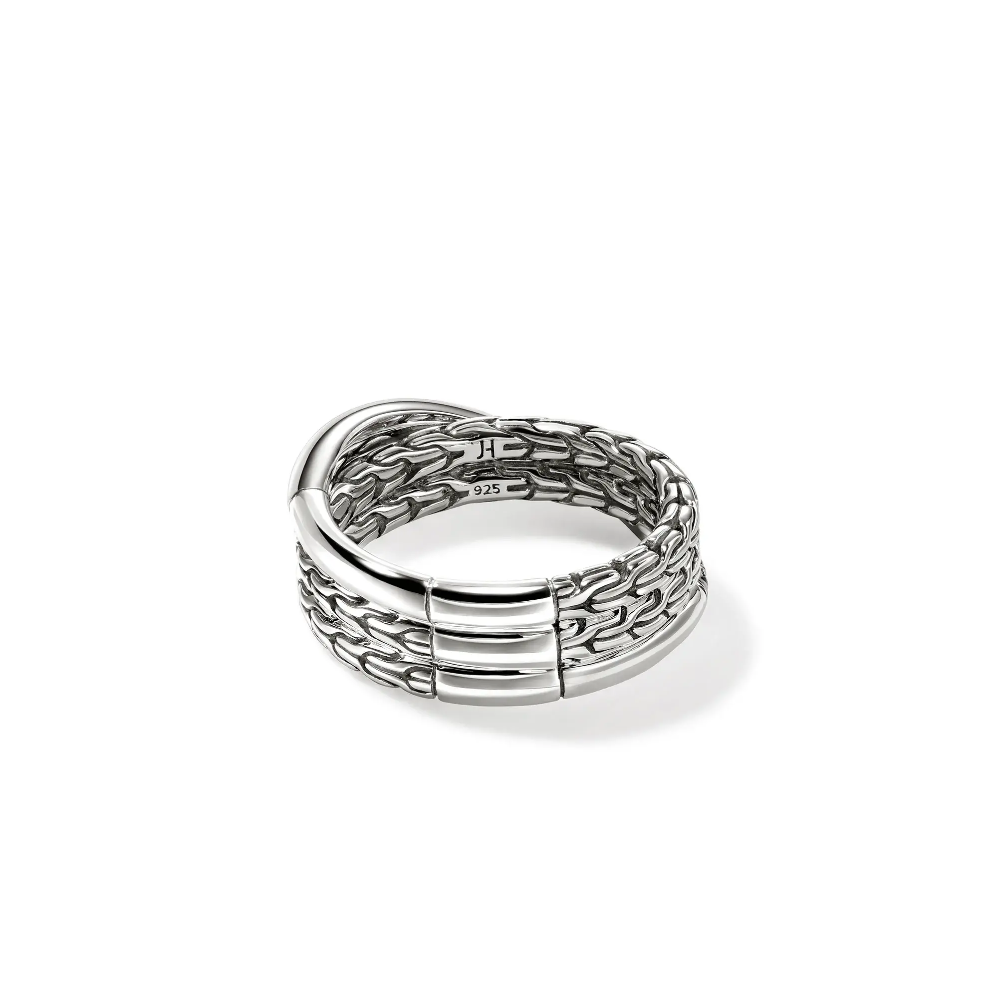 Bague à anneaux entrecroisés en argent sterling recyclé, présentant le motif de chaîne sculpté JH Essential emblématique de John Hardy. Façonnée à la main par des artisans. Largeur de l’anneau : 7,5 mm