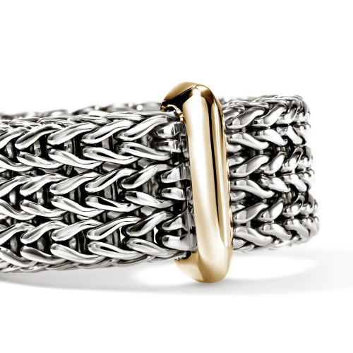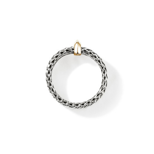 Une bague à tressage plat et homogène, au profil épuré, rehaussée d’un maillon au design minimaliste. Façonnée à la main par des artisans en argent sterling recyclé et en or.