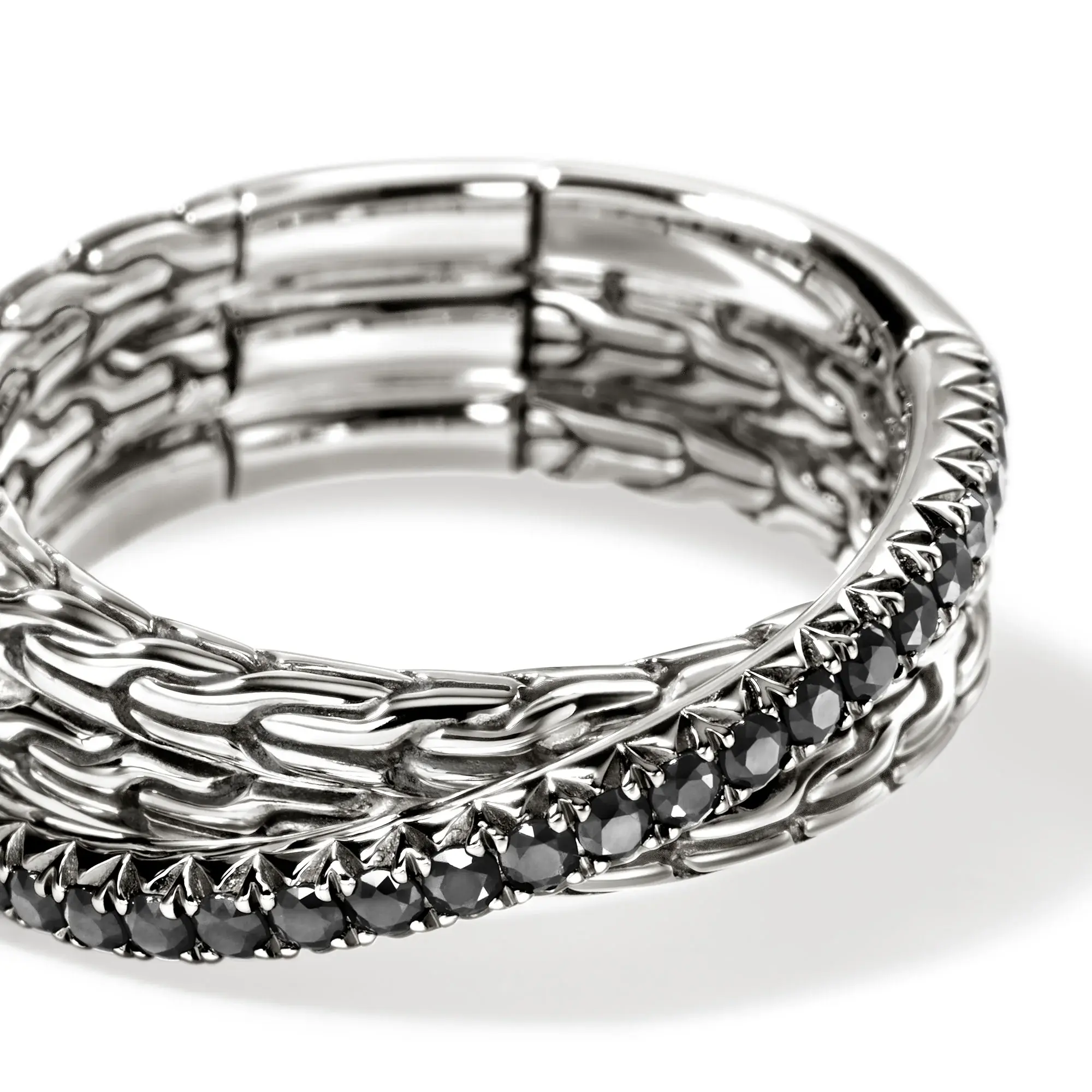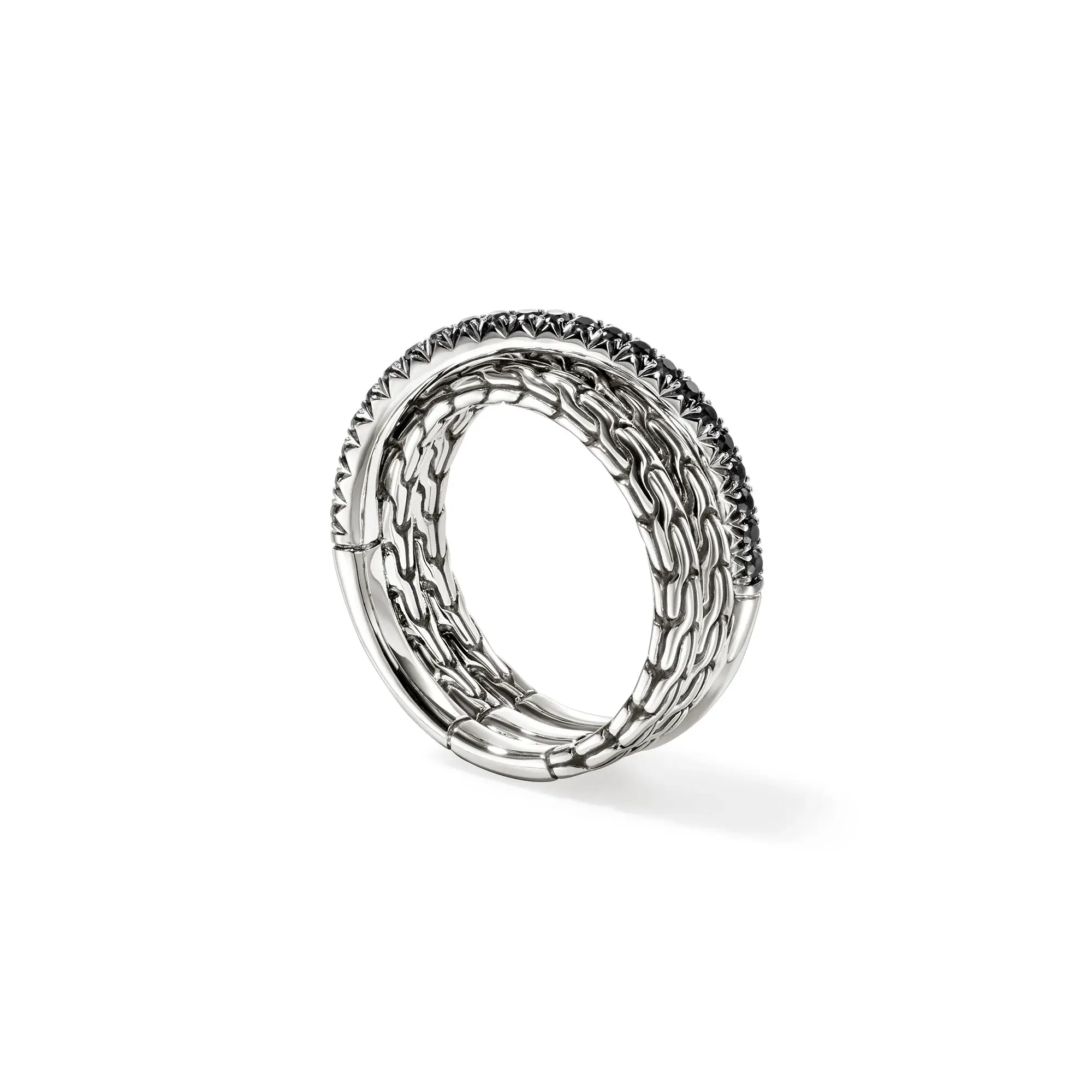 Bague à anneaux entrecroisés en argent sterling recyclé, pavée de saphirs noirs provenant de sources éthiques. Façonnée à la main par des artisans. Largeur : 7 mm.
