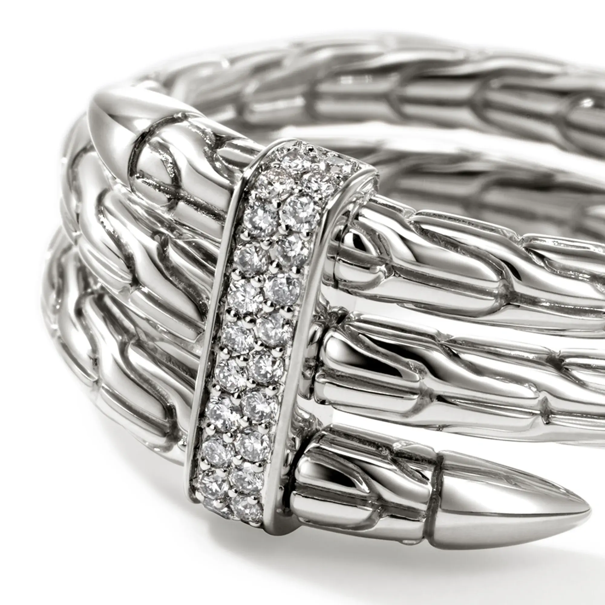 Élégance et audace. Cette bague en spirale est façonnée à la main par des artisans en argent sterling recyclé, ornée de diamants blancs provenant de sources éthiques.
