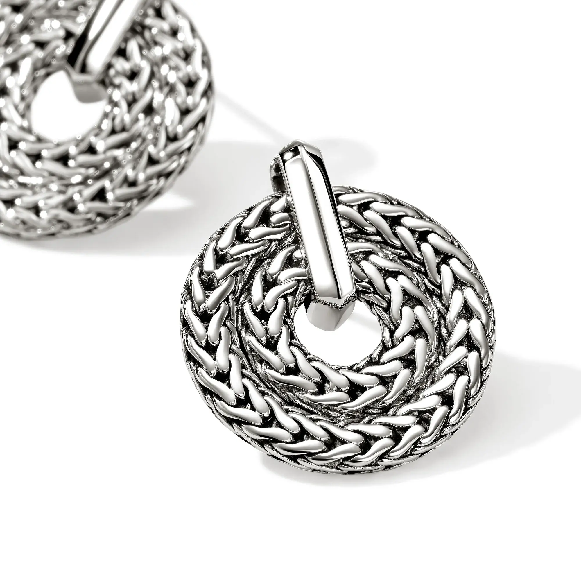 Des boucles d’oreilles au tressage homogène, au profil fin, rehaussée de maillons à arêtes vives. Façonnées à la main par des artisans en argent sterling recyclé.