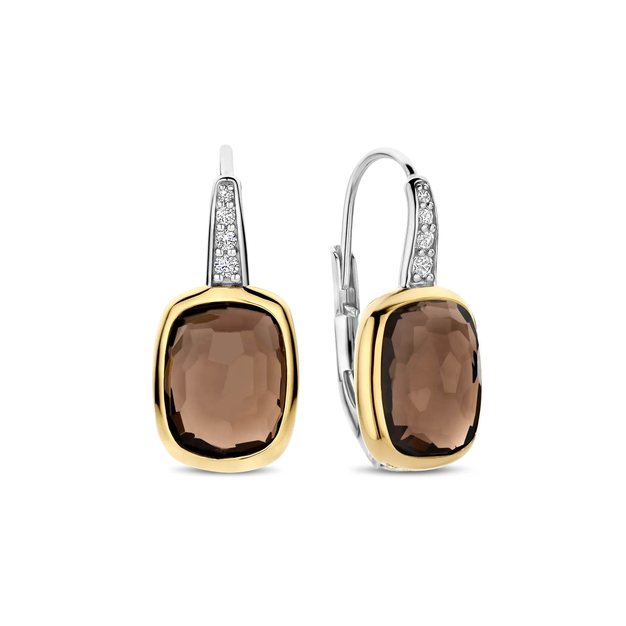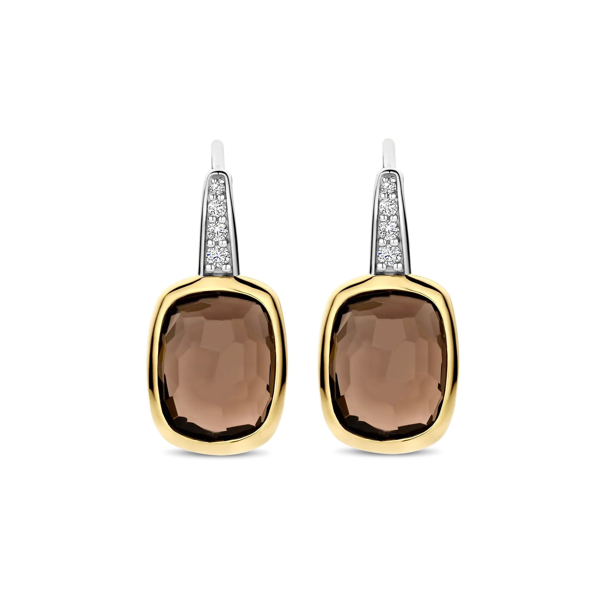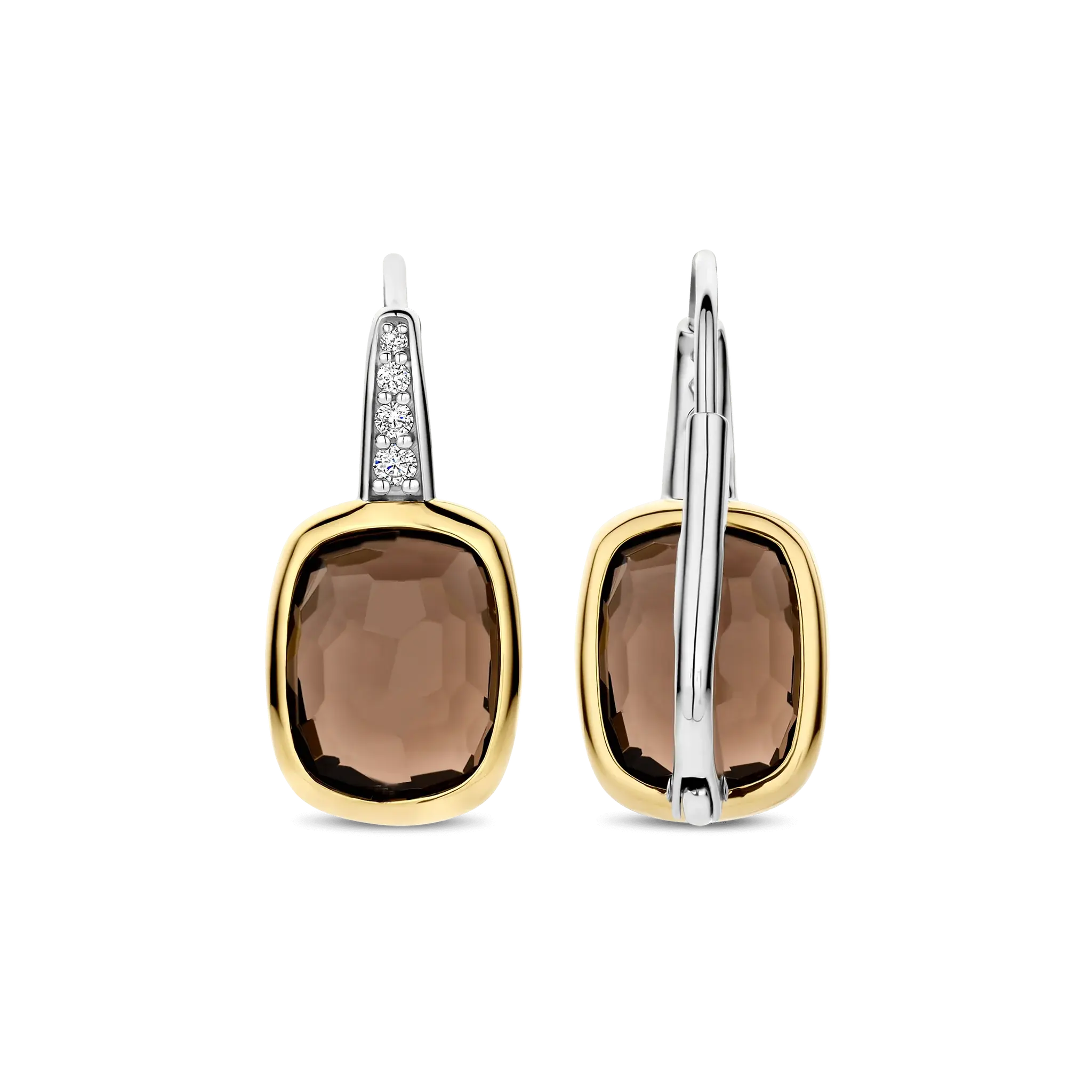Fabriquées en argent sterling 925, ces boucles d’oreilles dormeuses mettent en valeur une pierre translucide brun fumé en forme de coussin. La pierre est sertie dans un lisse entourage en or jaune et suspendue à un crochet plaqué platine, orné de zircones