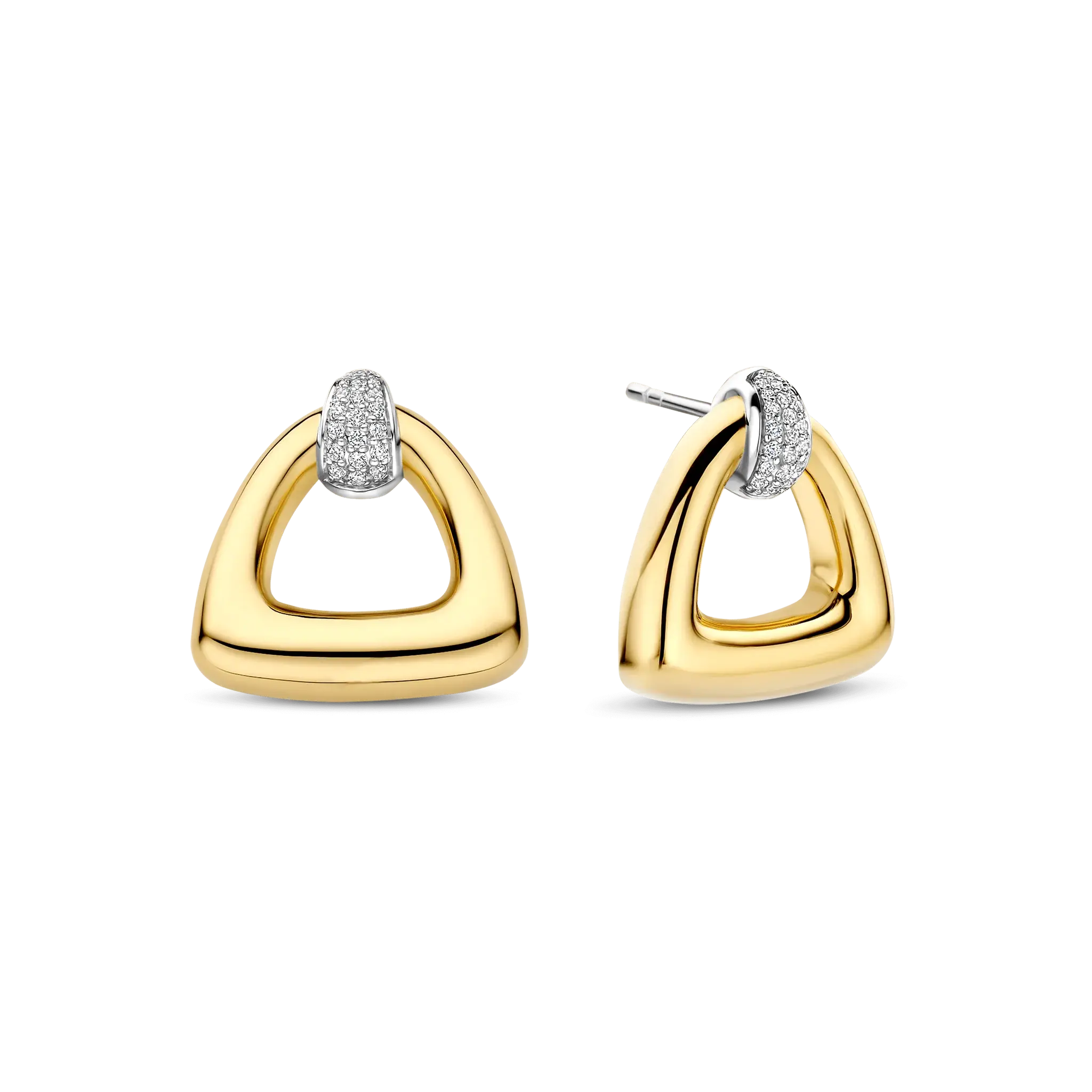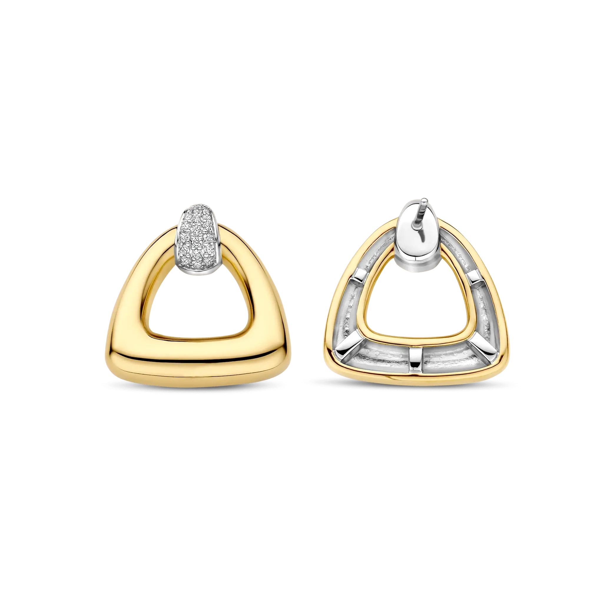 Fabriquées en argent sterling 925, ces boucles d'oreilles en forme de triangle ouvert sont baignés de plaquage or jaune éclatant. À leur sommet, un capuchon plaqué platine, serti de zircons cubiques brillants, ajoute un contraste frais.