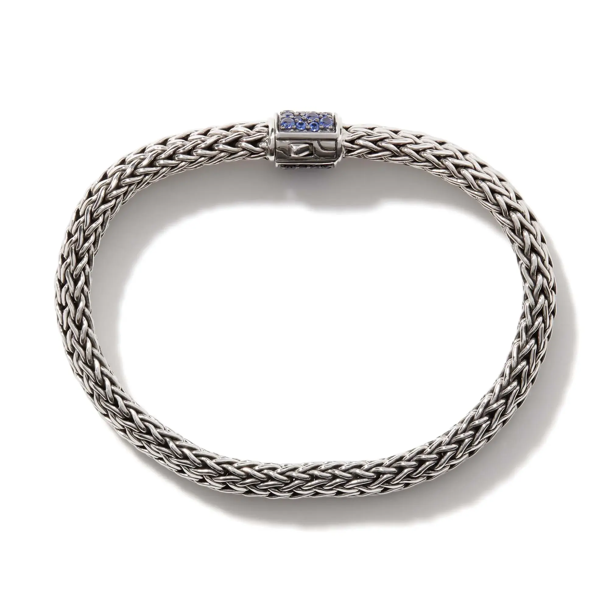 Tissé à la main en argent sterling recyclé, ce bracelet Icon Chain de 6,5 mm est réversible. Il est doté d’un fermoir réversible, avec des saphirs bleus d’un côté et des saphirs noirs de l’autre. Provenance éthique.