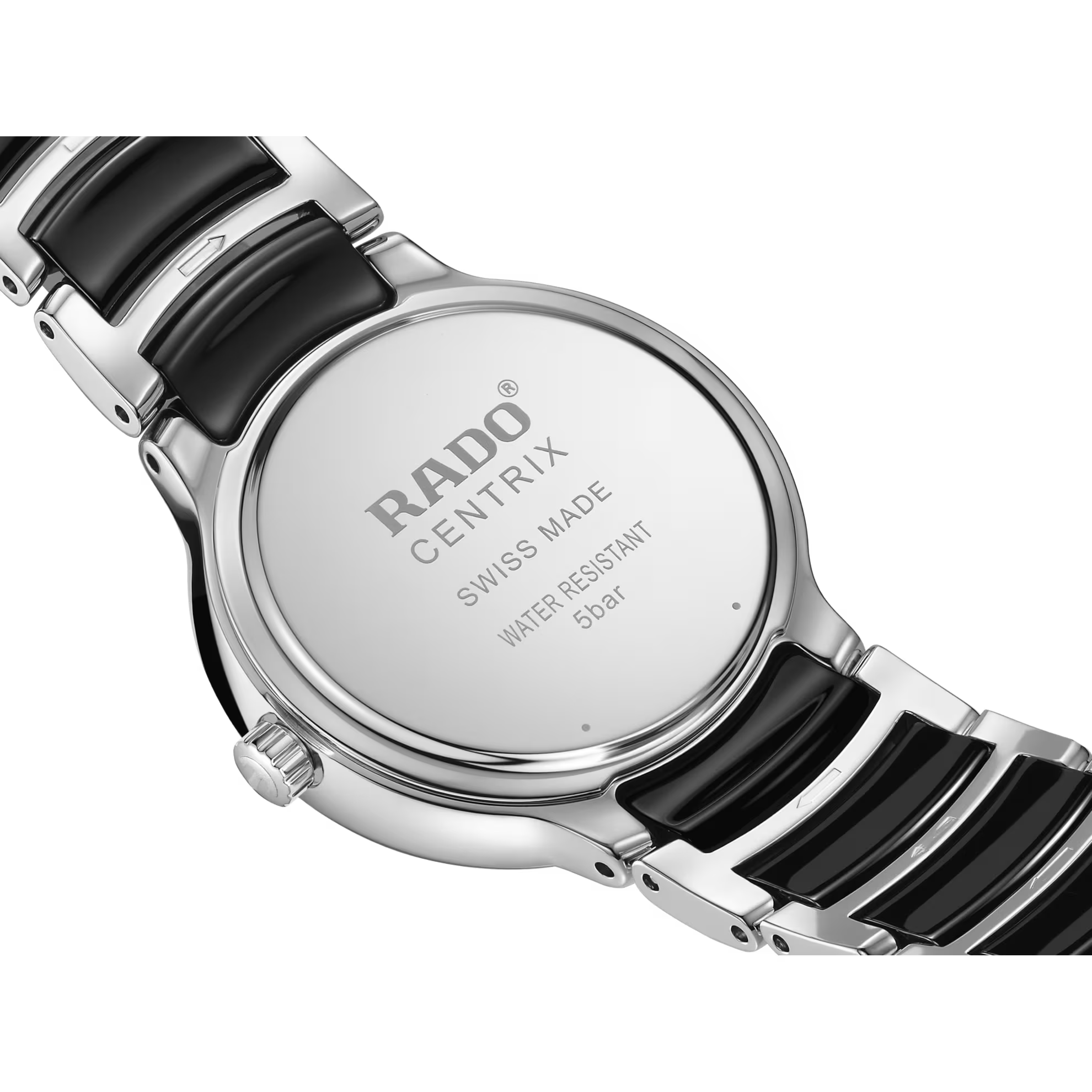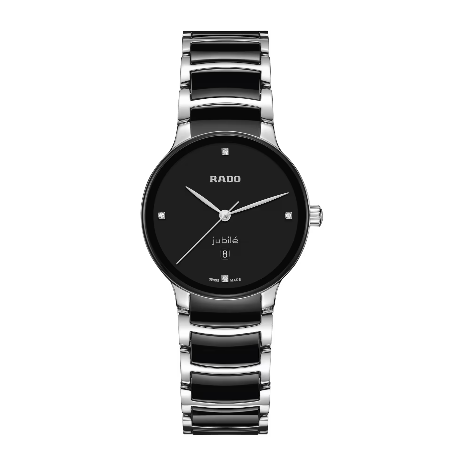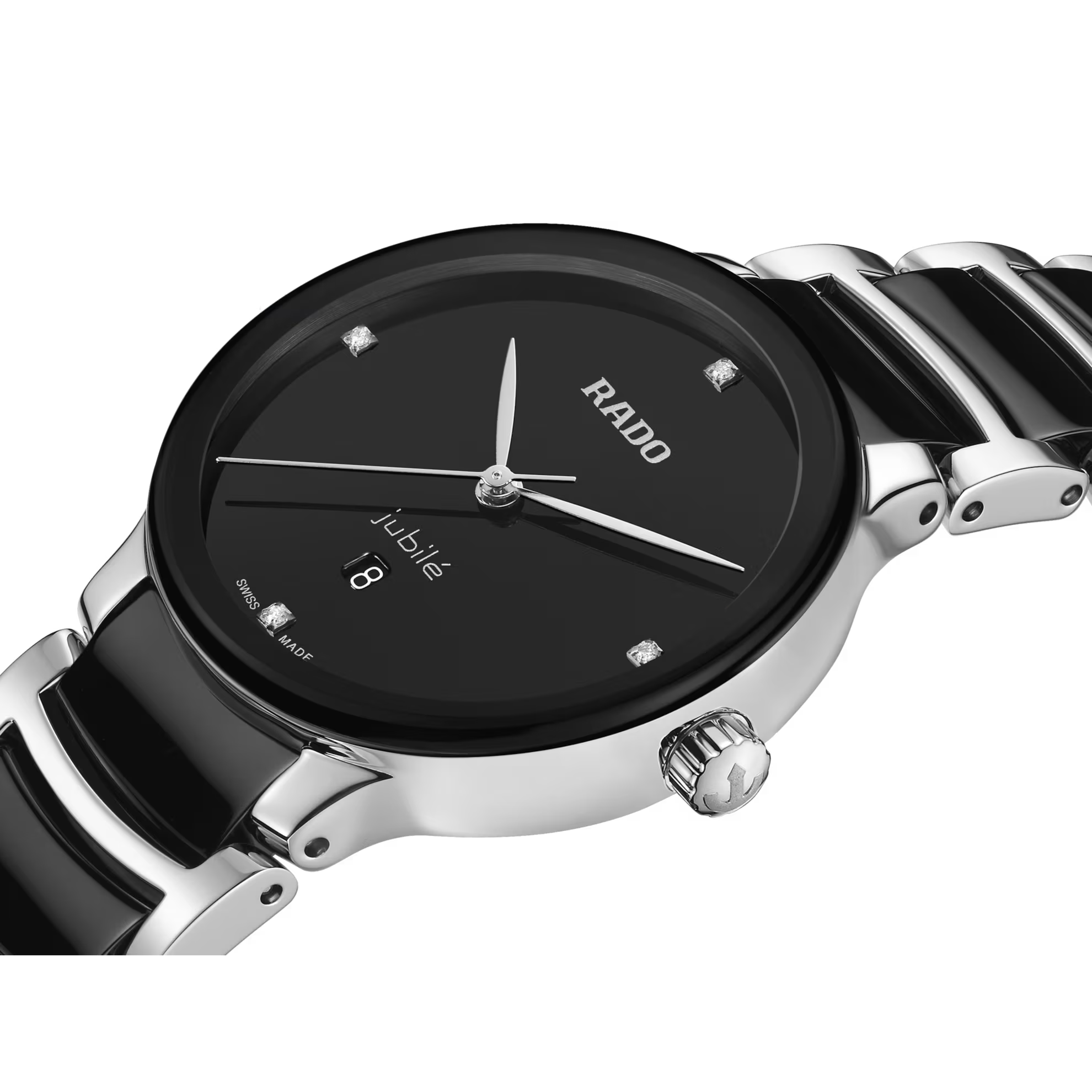 Le modèle classique Centrix Quartz Diamonds a été revisité sur le plan technique et esthétique. Le cadran laqué noir incrusté de 4 diamants et arborant le logo « jubilé » imprimé, se marie à la perfection aux aiguilles couleur rhodium.