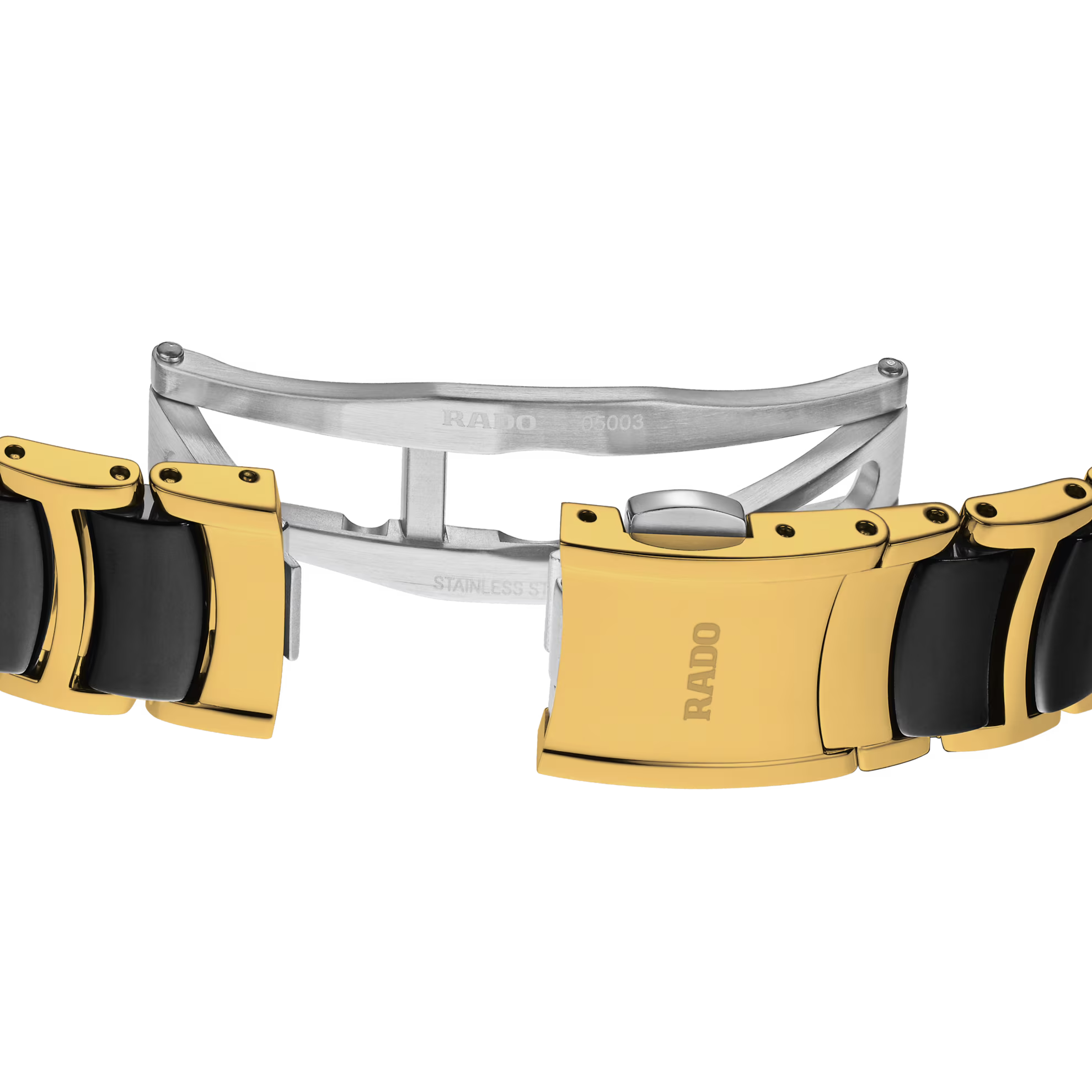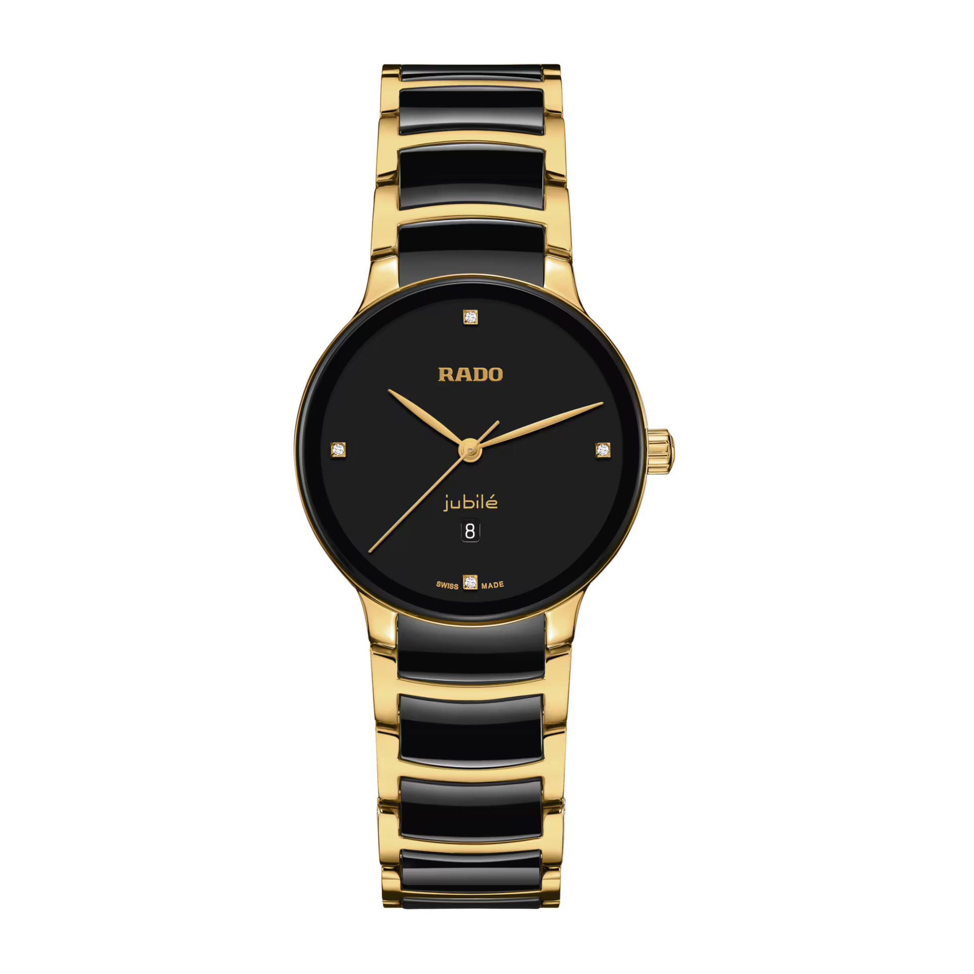 S'inscrireLe modèle classique Centrix Quartz Diamonds a été revisité non seulement sur le plan technique, mais aussi esthétique. Désormais, il présente un boîtier galbé qui se fond merveilleusement avec le bord du verre saphir arrondi. Les cornes ajustées et le bracelet en acier inoxydable avec traitement PVD couleur or jaune et maillons intermédiaires en céramique haute technologie noire viennent compléter le style de ce garde-temps emblématique. Le cadran laqué noir incrusté de 4 diamants et arborant le logo « jubilé » imprimé, se marie à la perfection aux aiguilles couleur or jaune. Grâce aux PreciDrive et HeavyDrive de son mouvement à quartz calibre R079, cette montre est plus précise et résistante aux chocs. Elle présente une étanchéité jusqu’à 50 m.