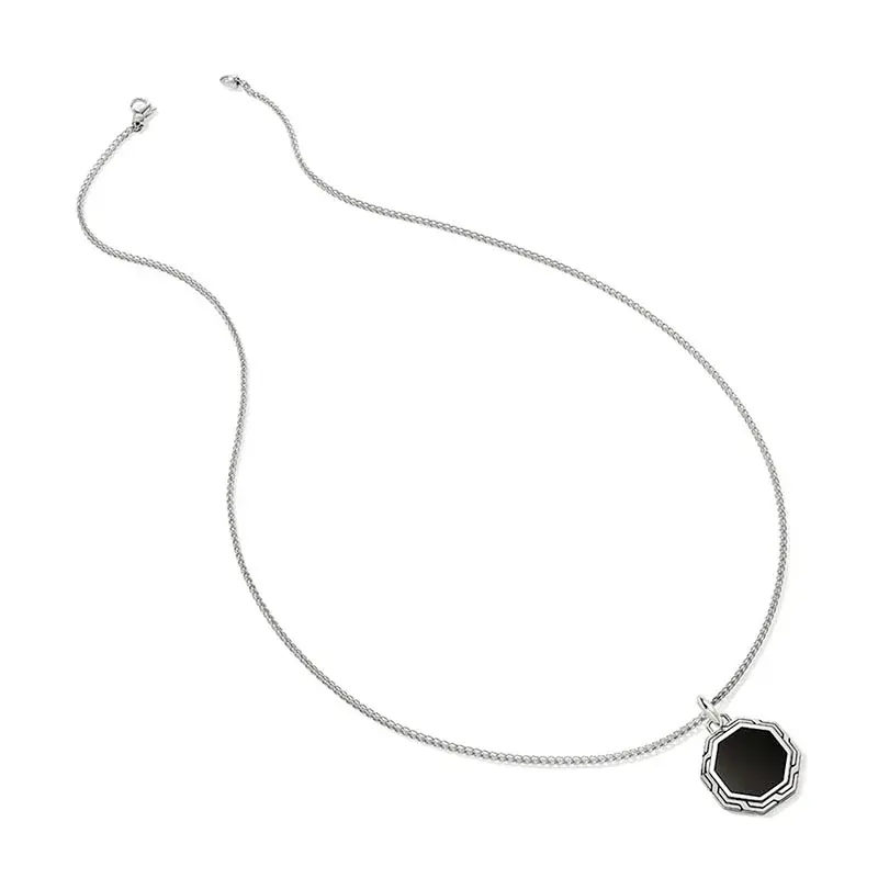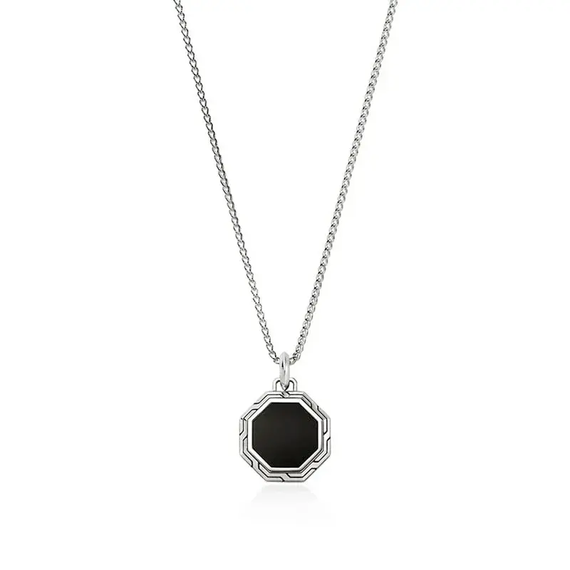 Pendentif octogonal en argent sterling recyclé et onyx noir, rehaussé de détails sculptés à la main, présenté sur une chaîne Surf de 1,7 mm et 22 po. Dimensions du pendentif : 29 mm × 20 mm.