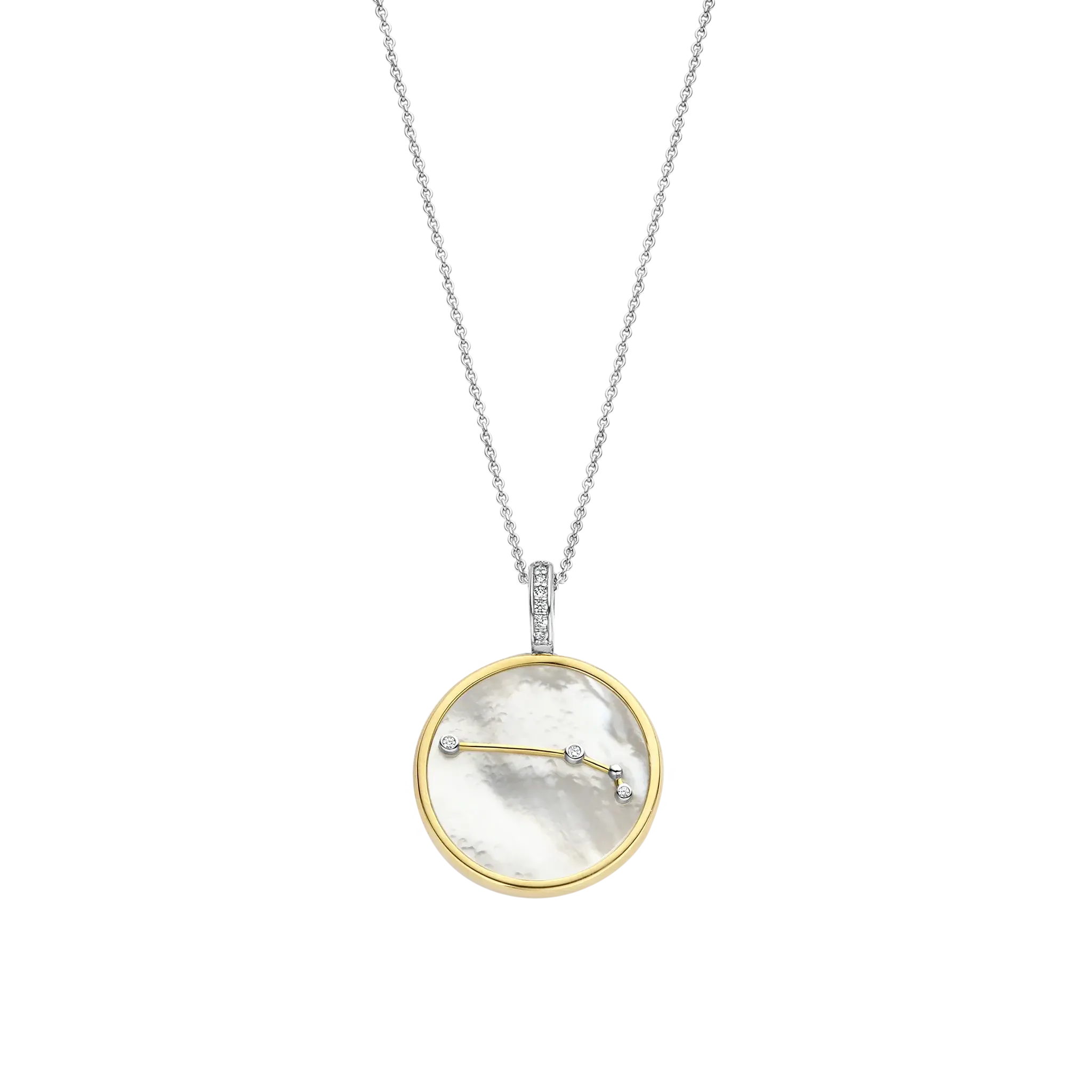 Ce pendentif du zodiaque représente le signe du Bélier. Confectionnée en argent sterling 925 de qualité supérieure, la constellation de l’archer est dorée à l’or fin et ornée de pierres en zircon cubique serties à la main sur un disque en nacre.