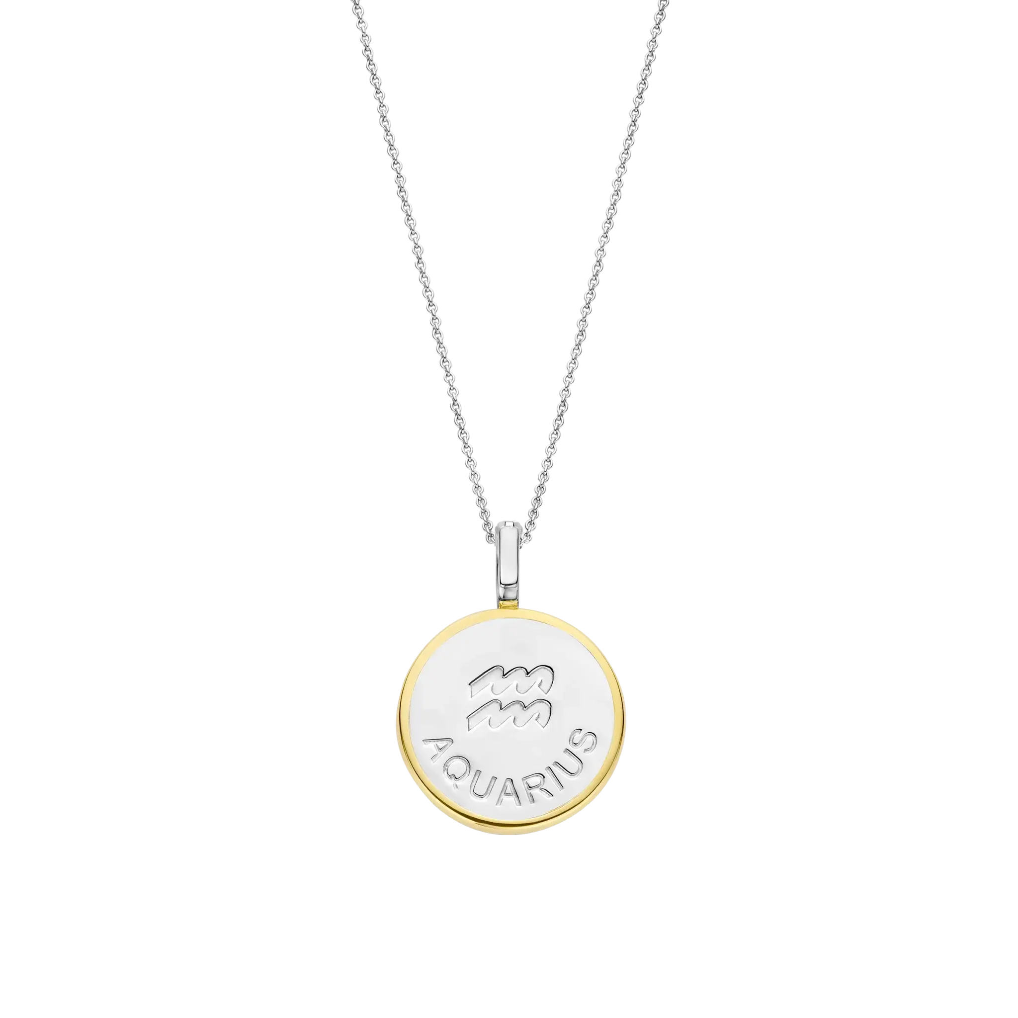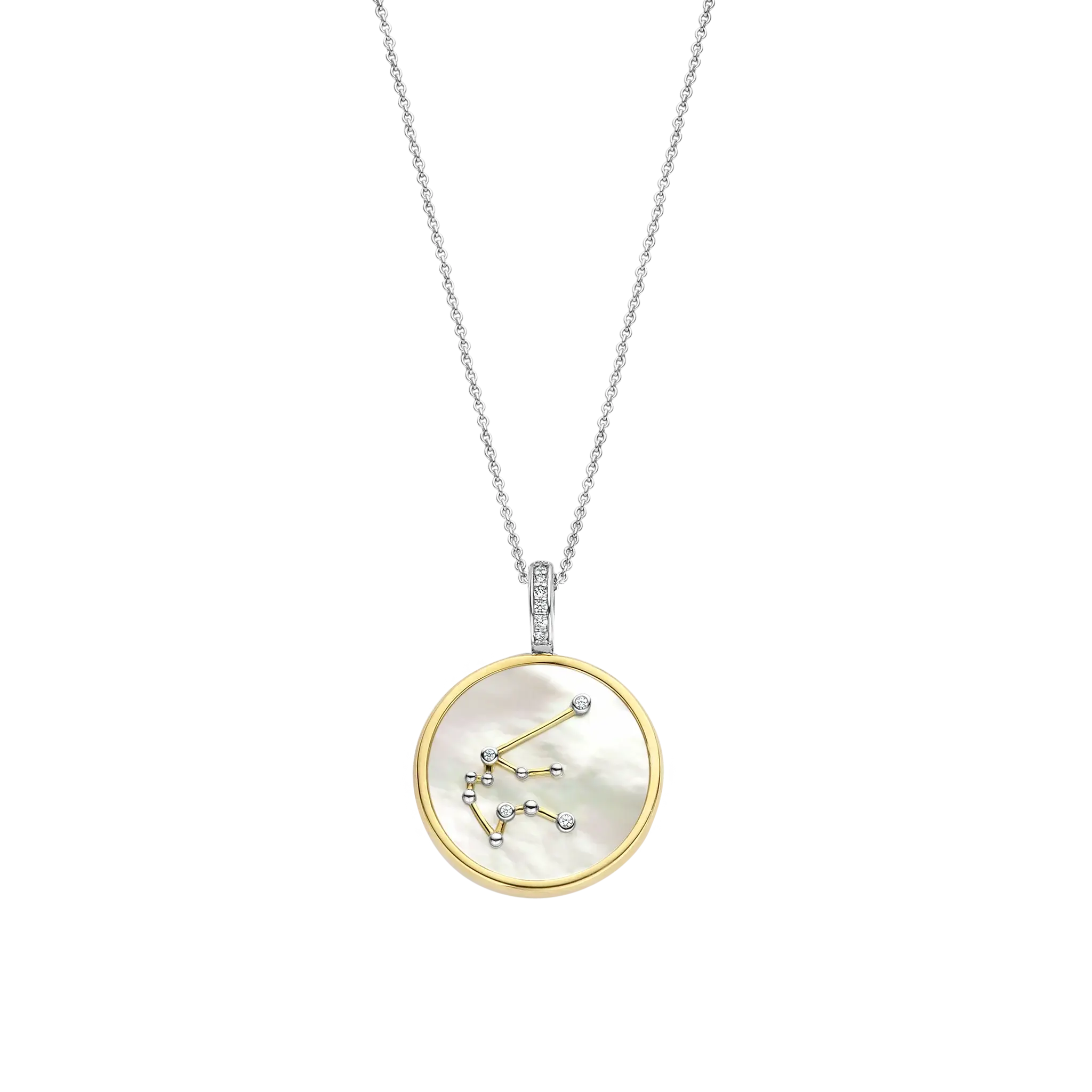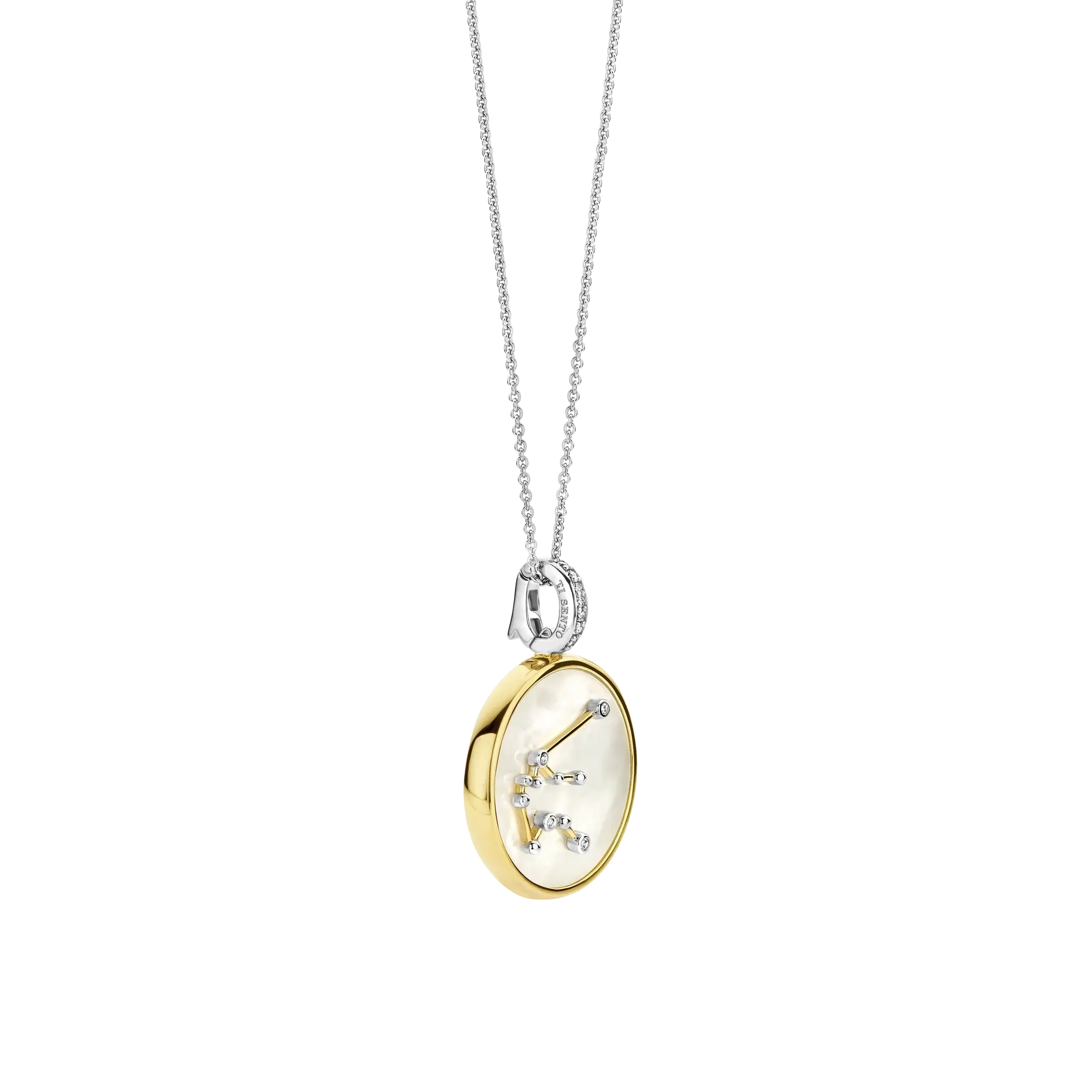 Ce pendentif du zodiaque représente le signe du Verseau. Confectionnée en argent sterling 925 de qualité supérieure, la constellation de l’archer est dorée à l’or fin et ornée de pierres en zircon cubique serties à la main sur un disque en nacre.