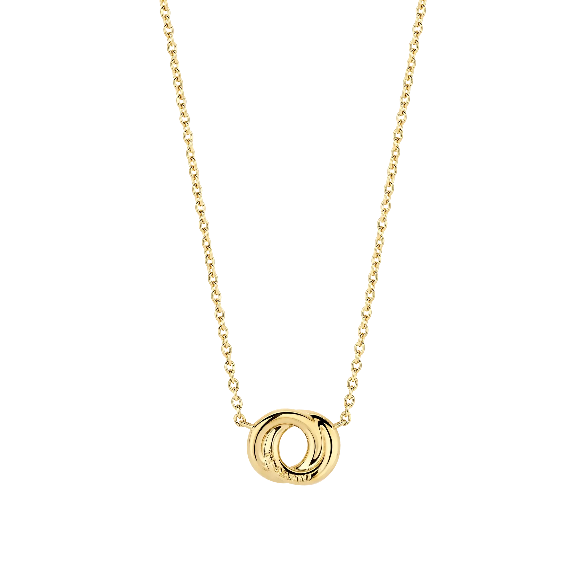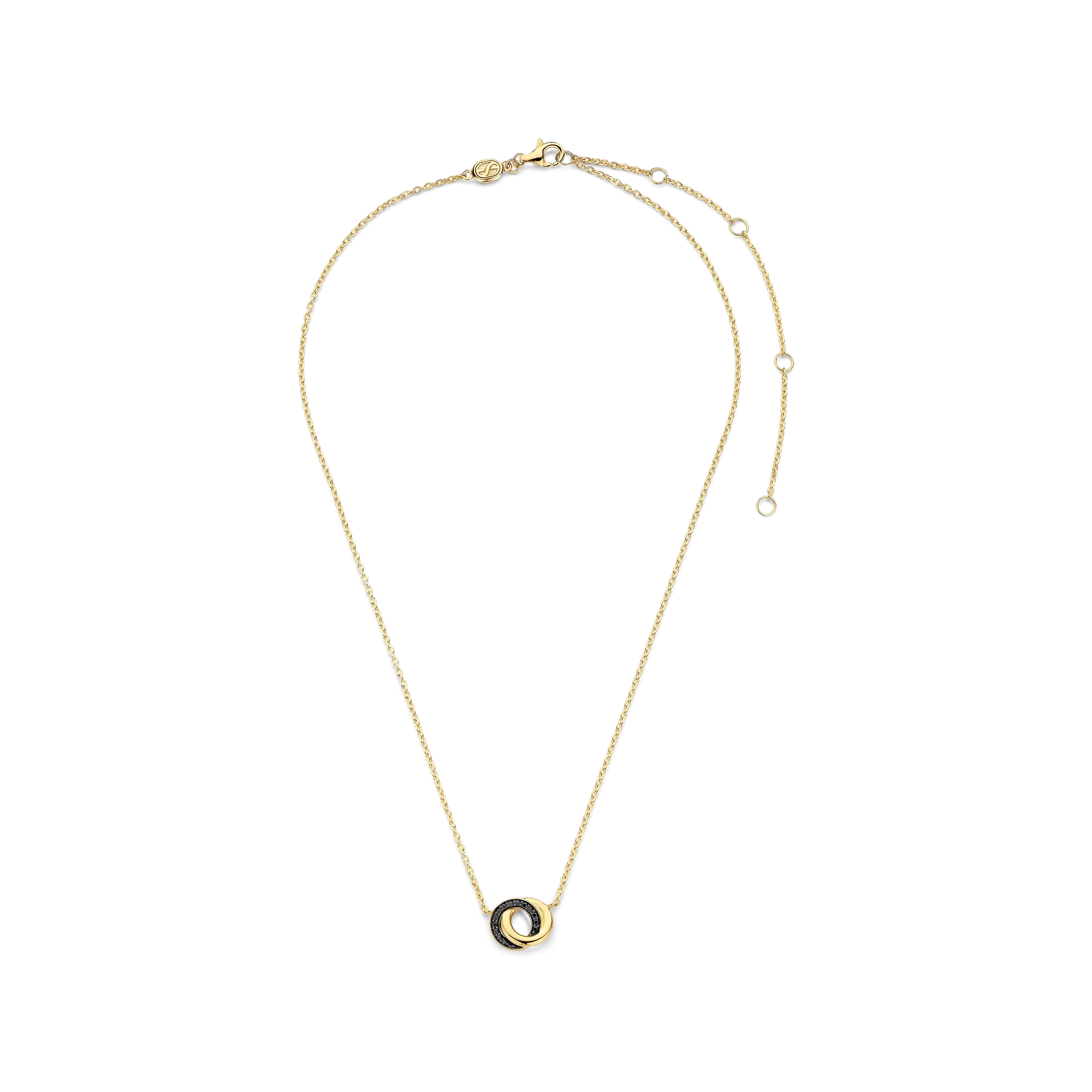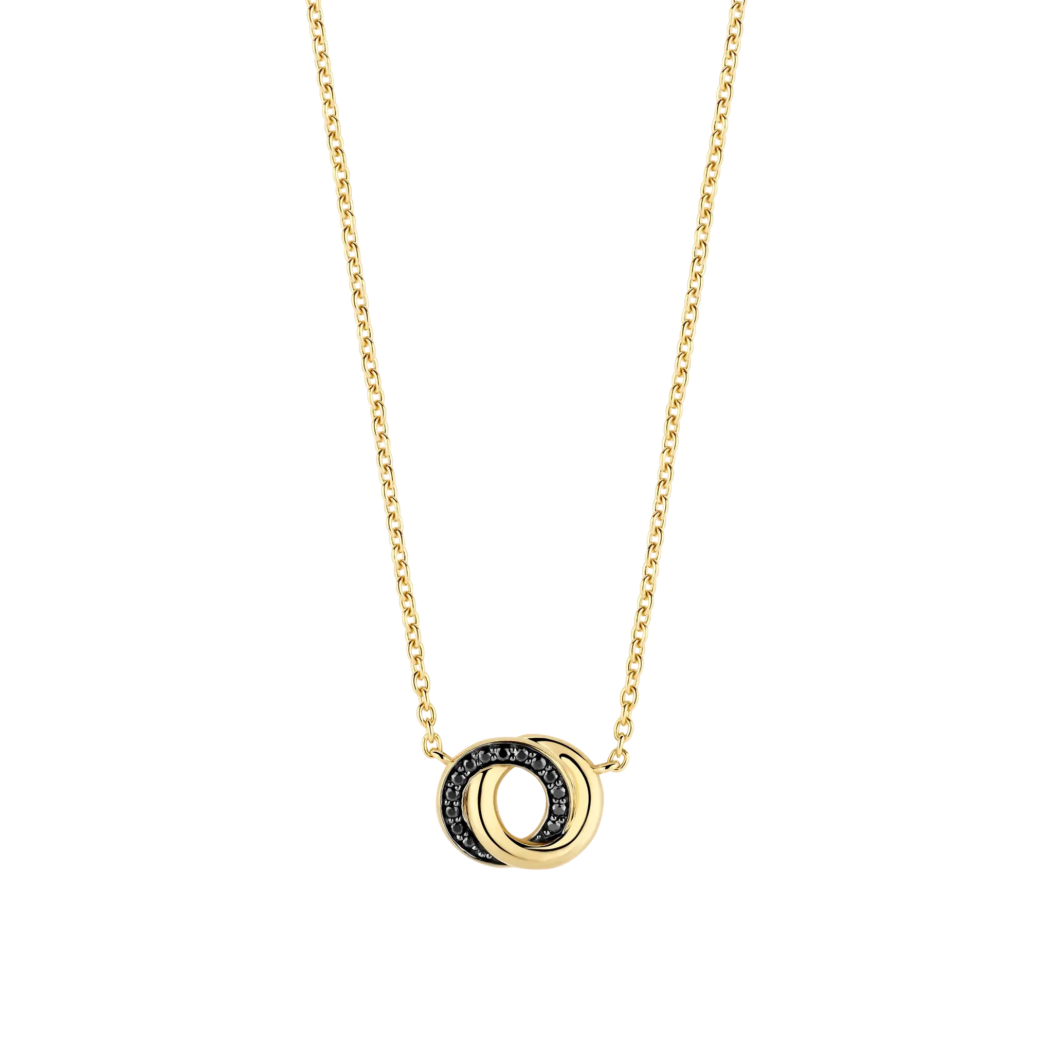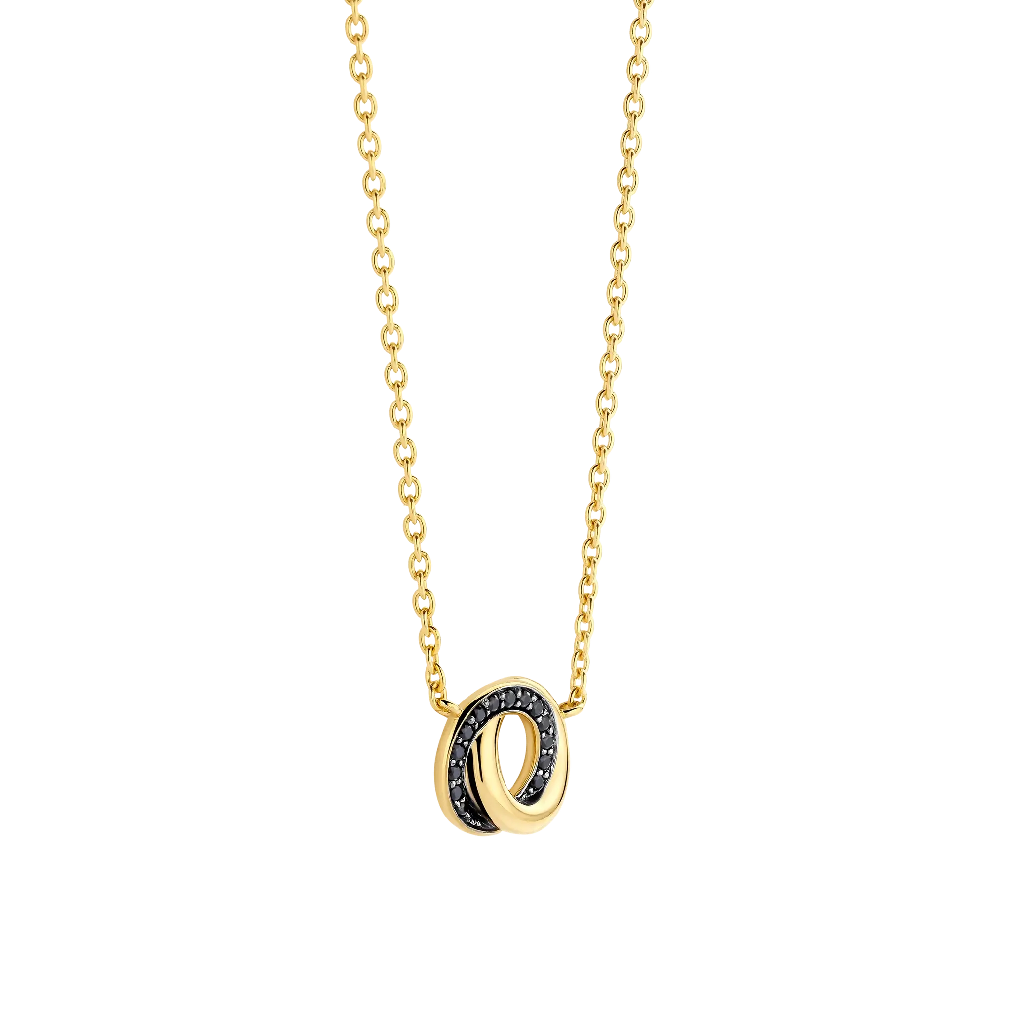 Deux cercles entrelacés forment un pendentif sculptural : l’un poli à un éclat miroir, l’autre orné de zircones noires serties à la main pour un contraste raffiné. Confectionné en argent sterling 925 et rehaussé d’une couche d’or jaune lumineux.