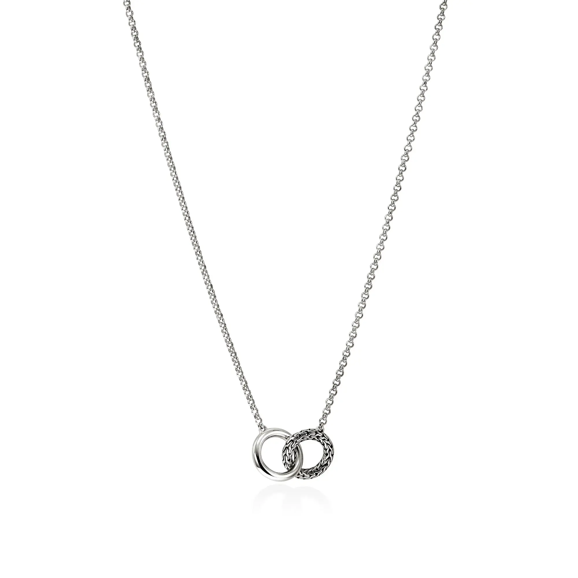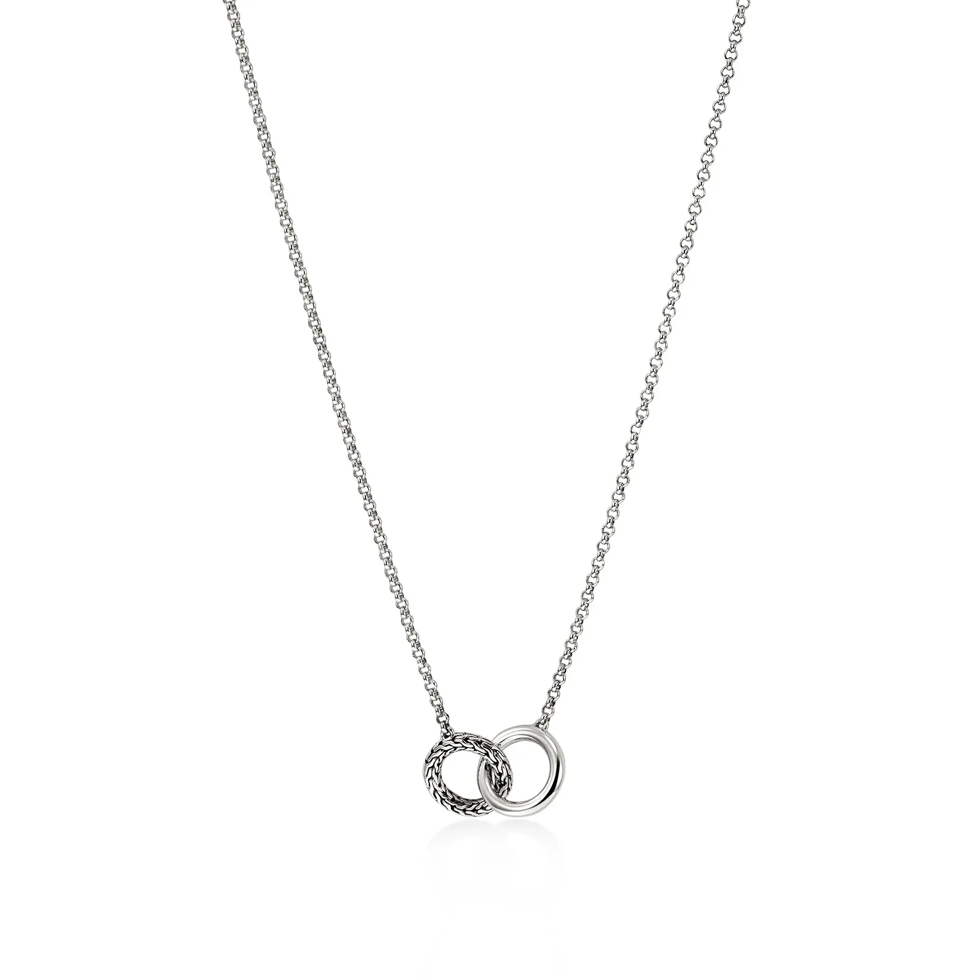 Un délicat collier aux anneaux connectés, mettant en vedette le motif de chaîne sculpté emblématique JH Essential en argent sterling recyclé. Façonné à la main par des artisans. Longueur réglable : 16 ou 18 pouces.