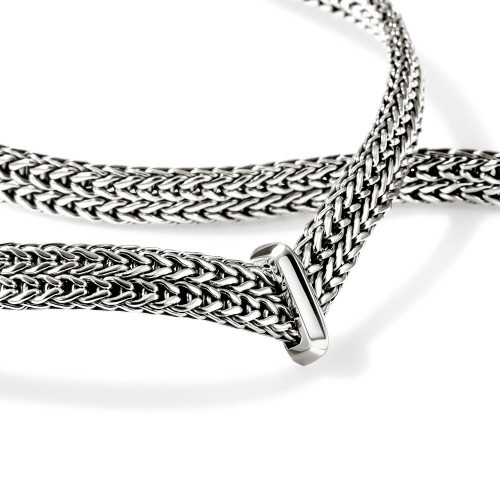 Ce collier au profil épuré présente un tressage d’une maîtrise technique remarquable, rappelant un textile tricoté. Façonné à la main par des artisans en argent sterling recyclé.