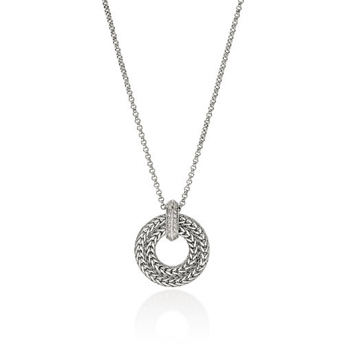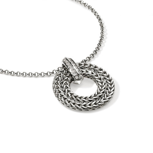 Ce pendentif au profil épuré présente un tressage d’une maîtrise technique remarquable, rappelant un textile tricoté. Façonné à la main par des artisans en argent sterling recyclés pavé de diamants.