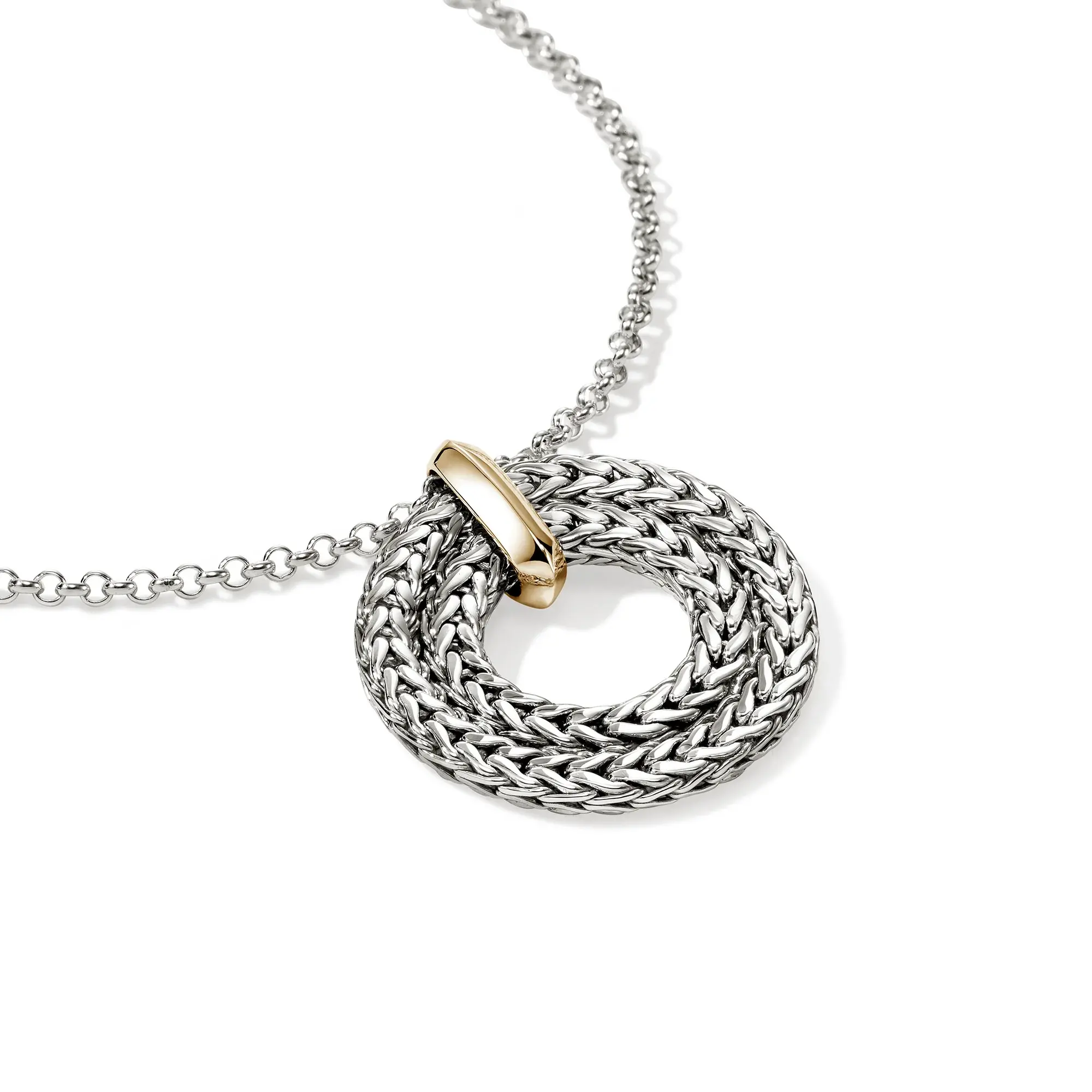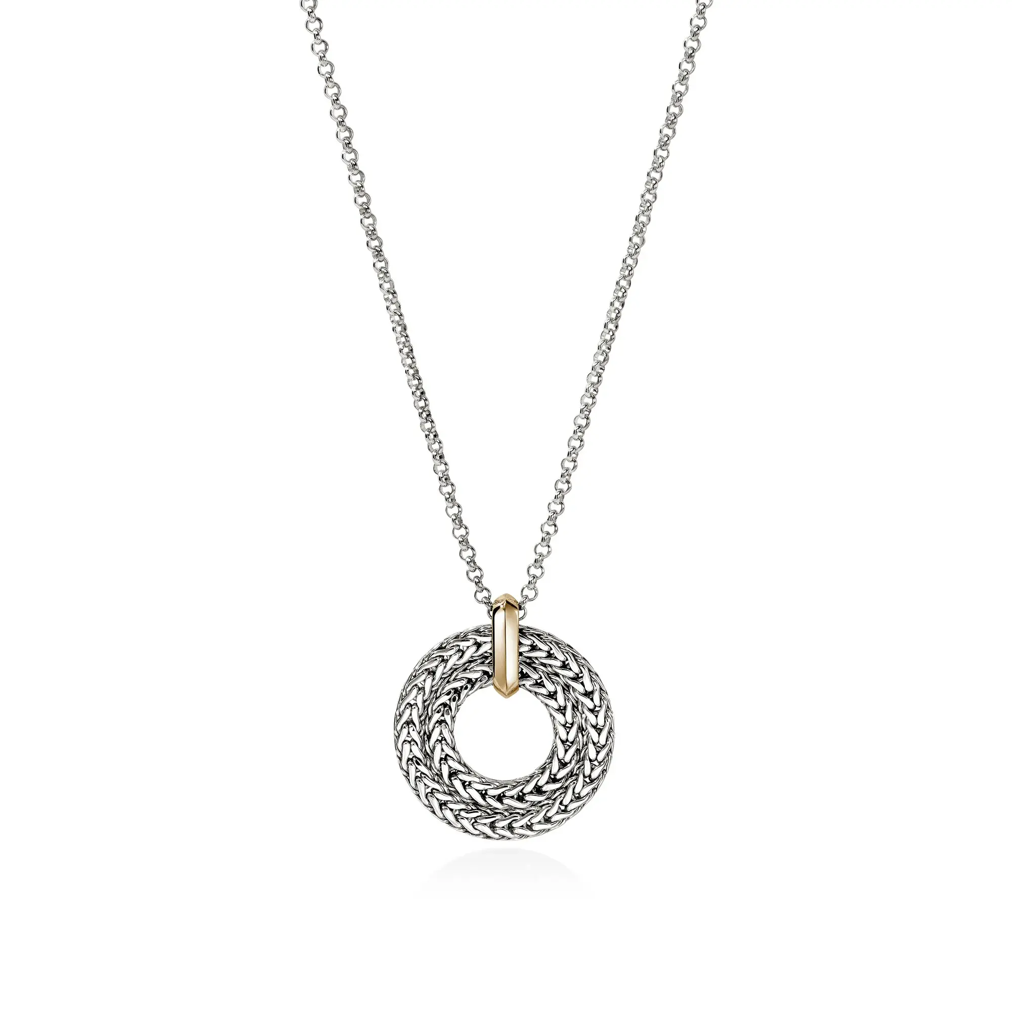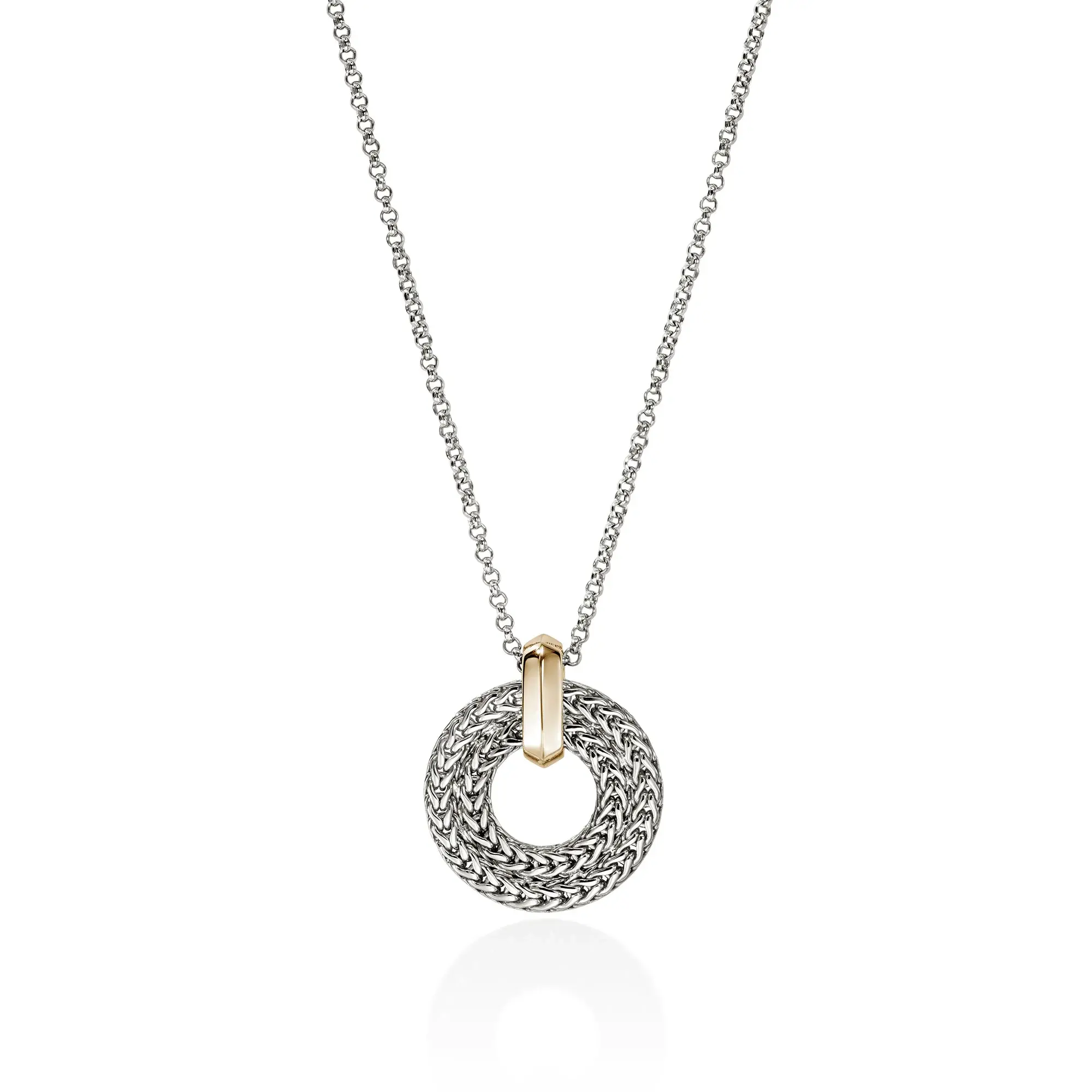 Ce pendentif au profil épuré présente un tressage d’une maîtrise technique remarquable, rappelant un textile tricoté. Façonné à la main par des artisans en or et argent sterling recyclés.