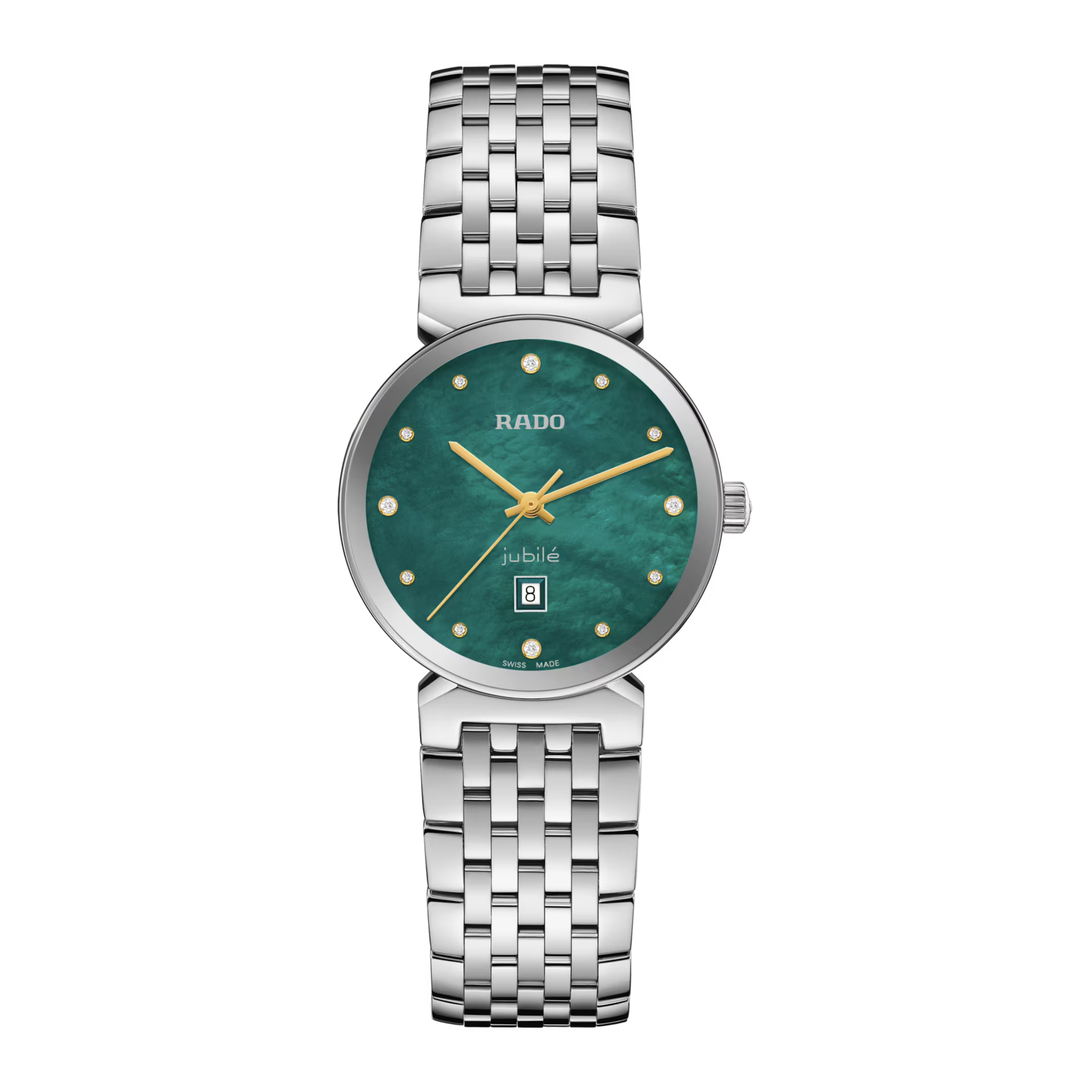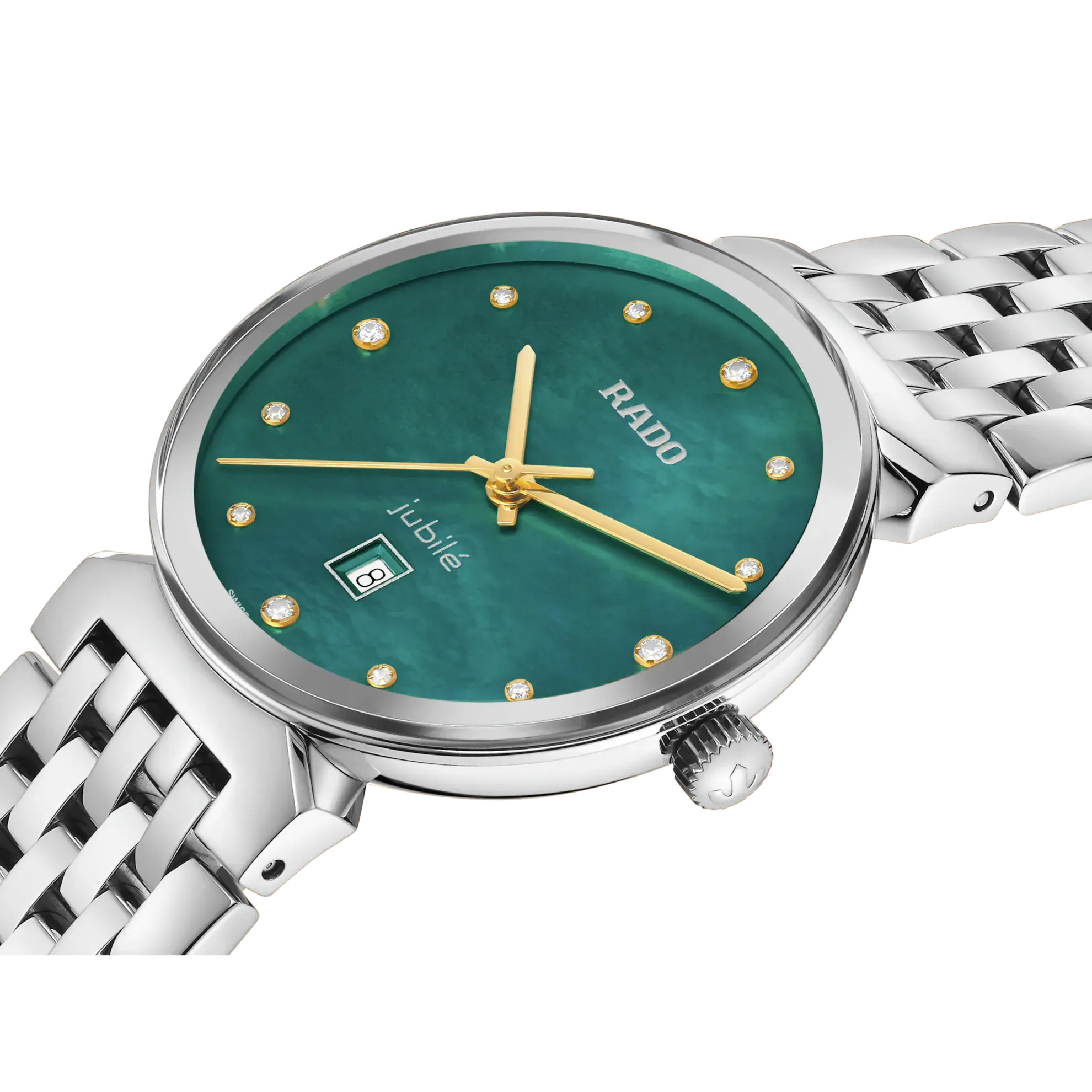 S'inscrireLe modèle 30 mm présente un verre saphir bombé et biseauté bord-à-bord. Le boîtier, la couronne, la lunette et le fond de boîtier sont en acier inoxydable poli. Le bracelet également en acier inoxydable poli complète l’apparence globale de ce garde-temps classique. Le cadran en nacre vert incrusté de 12 diamants et arborant le logo « jubilé » imprimé couleur argent se marie à la perfection avec les aiguilles couleur or jaune. La montre est résistante jusqu’à 50 m et également disponible en taille L, ce qui en fait une montre couple idéale.