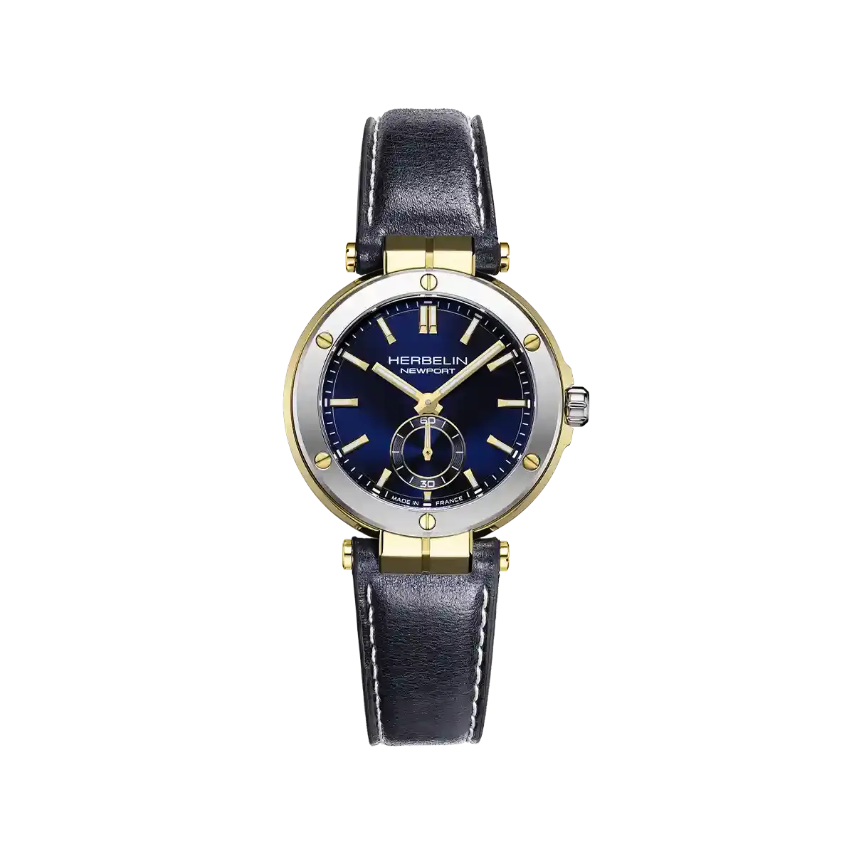 La montre NEWPORT exprime le caractère élégant et marin d’Herbelin dans un format raffiné de 35 mm. Son boîtier en acier inoxydable 316L associé à une lunette PVD or jaune s’harmonise avec un cadran bleu intense, animé par une petite seconde à 6h.